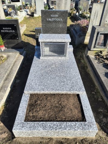 Realizace jednohrobu ze světlé žuly TARN a tmavé žuly IMPALA na nových základech a žulové schránky na 2 urny. Likvidace původního jednohrobu.